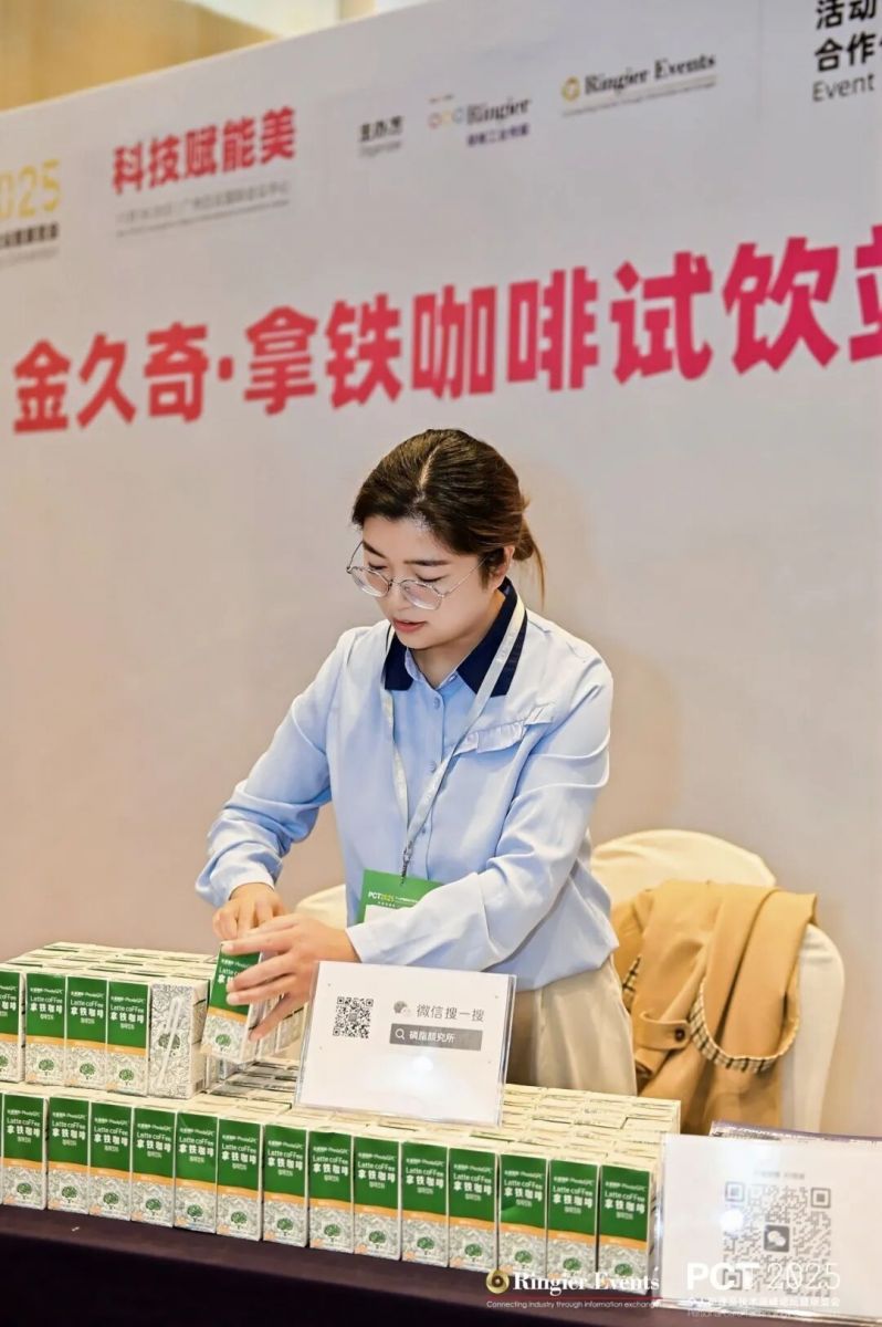 金久奇设置的免费拿铁站几乎全程满位。加入 Phoslip GPC 的咖啡被定位为“长效思维续航”,为长时间交流洽谈提供状态支撑。