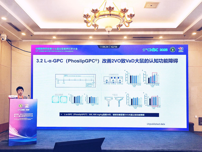 沈阳药科大学杨静玉教授在《L-α-GPC功效循证及改善血管痴呆症的研究》中进一步介绍,中国国家卫生与健康委员会于2024年3月批准L-x甘磷酸胆碱(L-α-GPC)为新食品原料,为胆碱的膳食补充提供了一个全新的选择。循证研究显示,在评估L-x-GPC与胞二磷胆碱治疗血管性痴呆患者的多中心试验中,在大多数指标中,L-α-GPC相比具有更高的疗效和耐受性。以PhoslipGPC®品牌的L-α-GPC为实验材料,改善血管性痴呆大鼠认知功能障碍的实验证明,L-a-GPC可以缓解白质损伤、促进少突胶质细胞发育、改善血管性痴呆的认知功能障碍。
